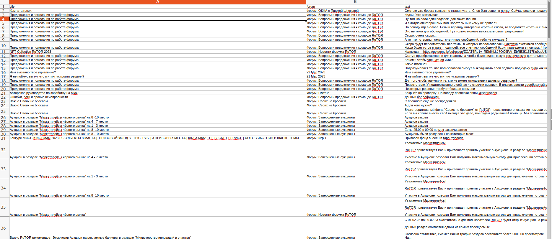 И получаем статистику всех постов с датой, названием, и разделом. Переодически нас будет останавливать блок от анти ддоса. Благо он легко обходится сменой identity tor, учел в коде. Кукисы работают на новой сессии всегда автоматом. Также выставлены длительные таймауты.