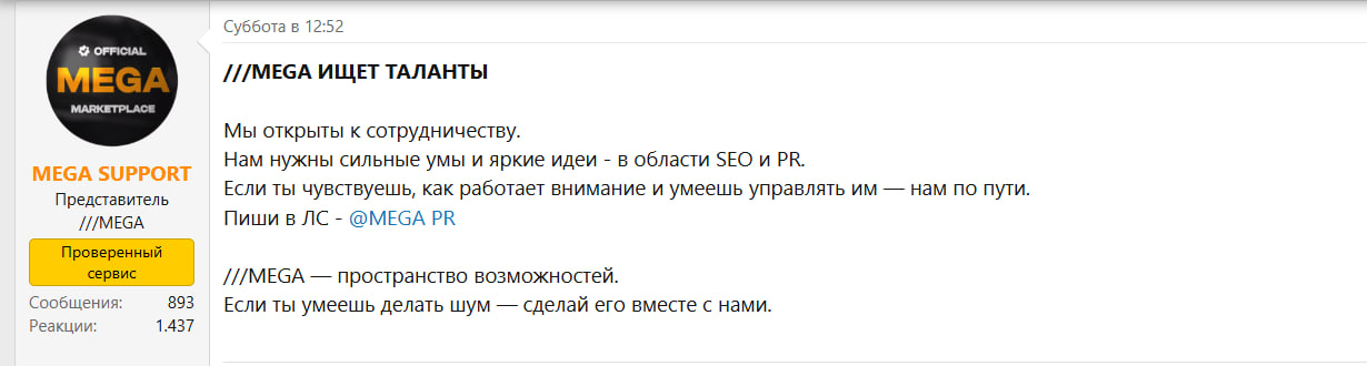 На выходных на форуме RuTOR появился пост от представителя MEGA — команда объявила о поиске специалистов в области SEO и PR, способных привлекать и удерживать внимание аудитории.